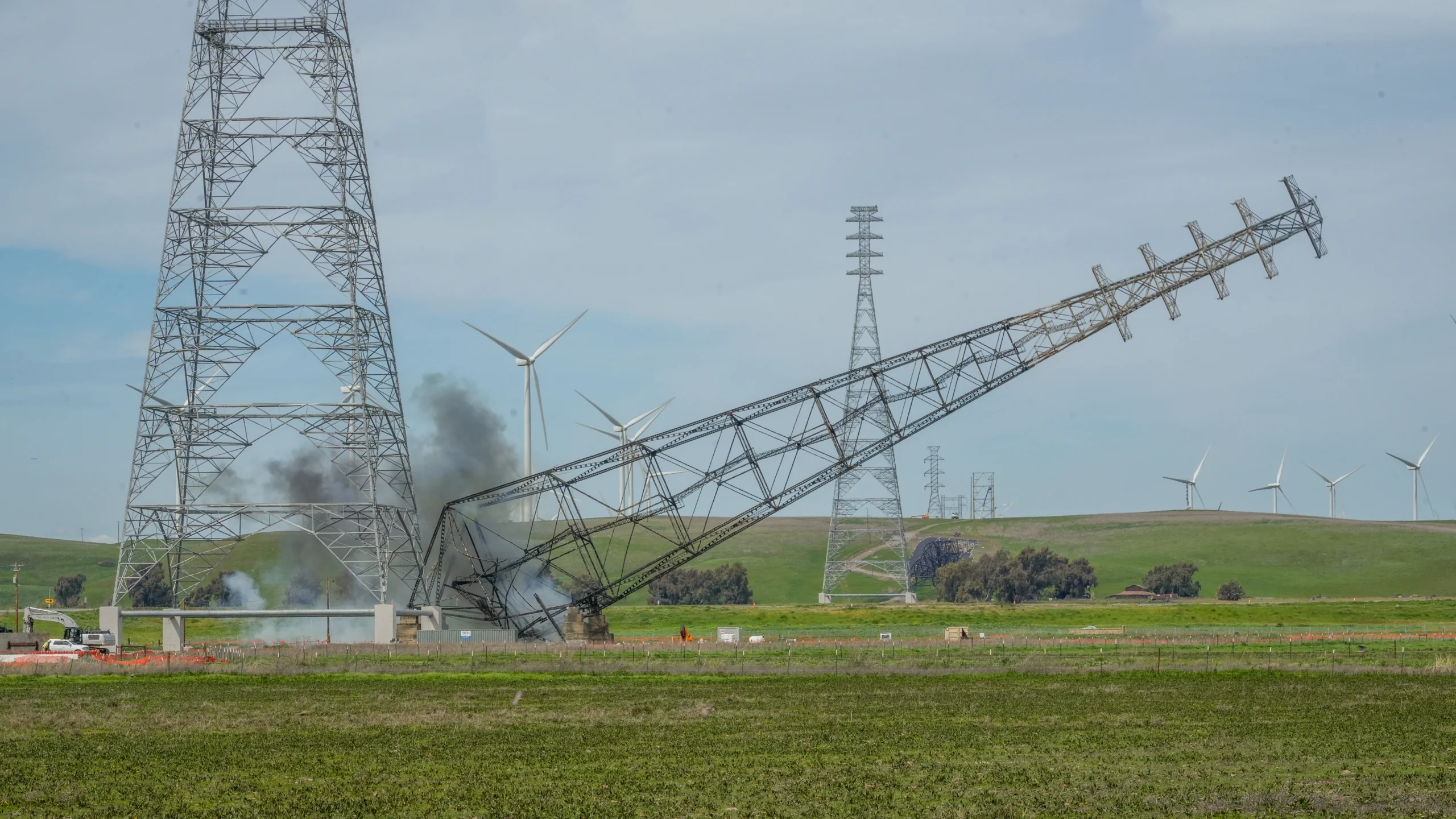 As part of the 1.5-mile Birds Landing 230-kV Transmission Line Upgrade project in Rio Vista, CA, Michels Pacific Energy crews prepared the site, installed new tower foundations, pulled conductor and static wires into place, installed a temporary bridge, and built four new lattice steel towers—before taking down four old ones.