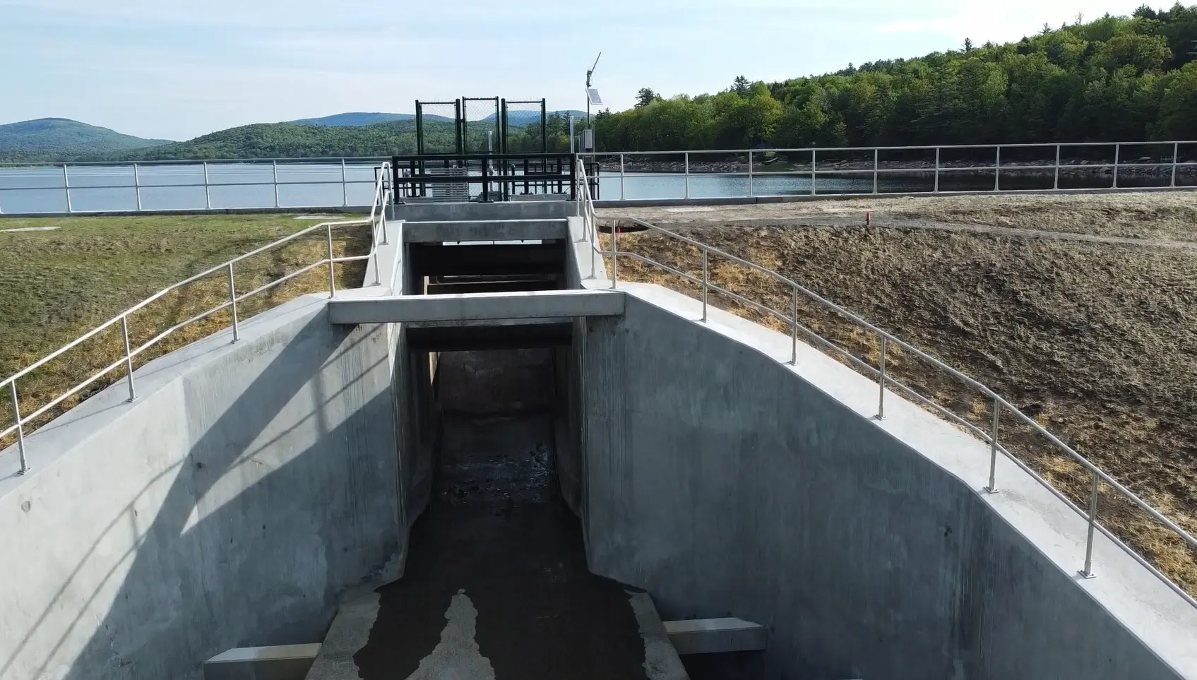 The rehabilitation work included rebuilding/flattening the downstream slope for stability, installing relief wells and underdrain system, replacing the wooden gates with custom-fabricated stainless-steel slide gates, reconstructing the concrete spillway, replacing the bridge for vehicle access over the spillway, and fabricating toe drainage pipe on-site.